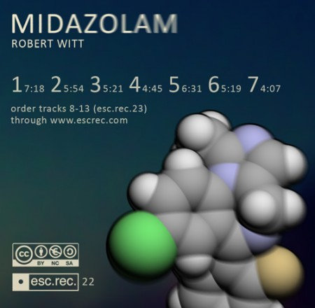 Zo ook de nieuwste van Robert Witt. Er staat de helft van een aantal composities op. De eerste zeven tracks passeren met ieder vier seconden stilte. “Download ‘Midazolam’ tracks 1-7 (esc.rec.22) for free through www.escrec.com“, zegt het hoestekstje.